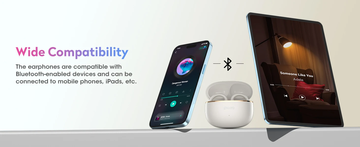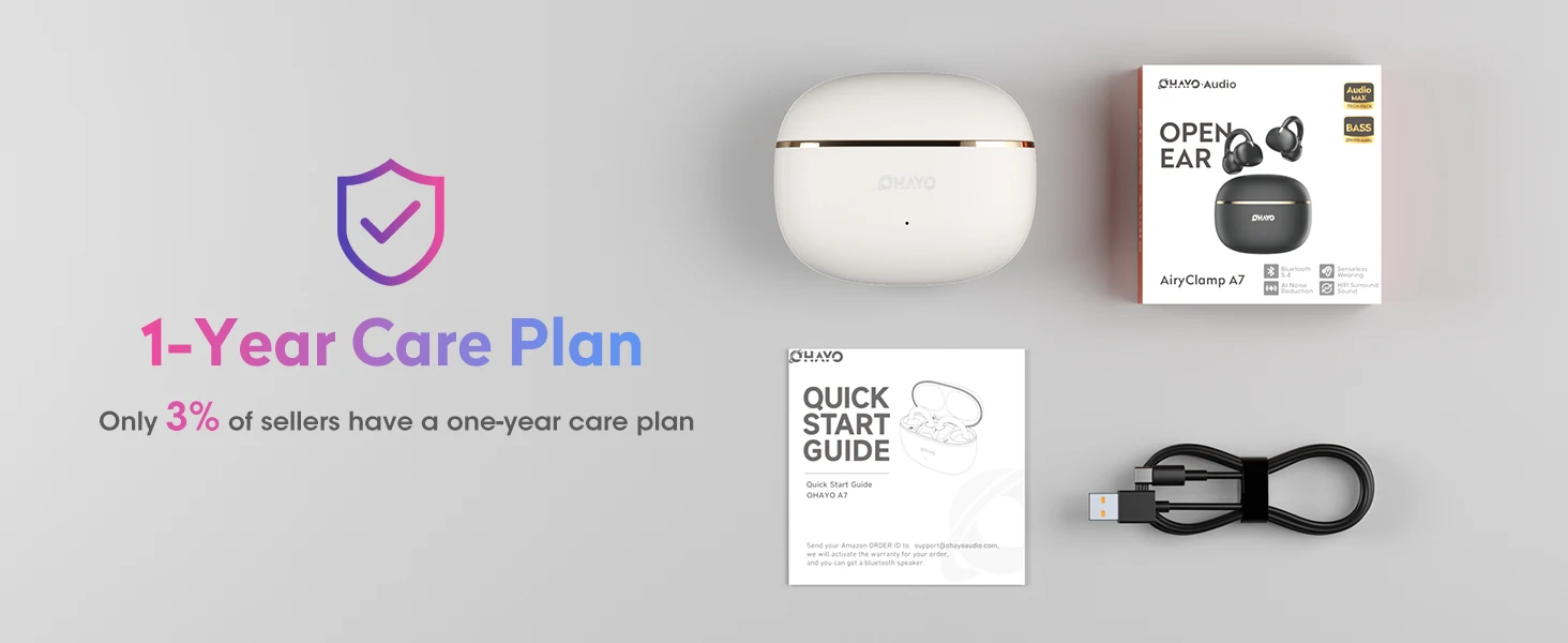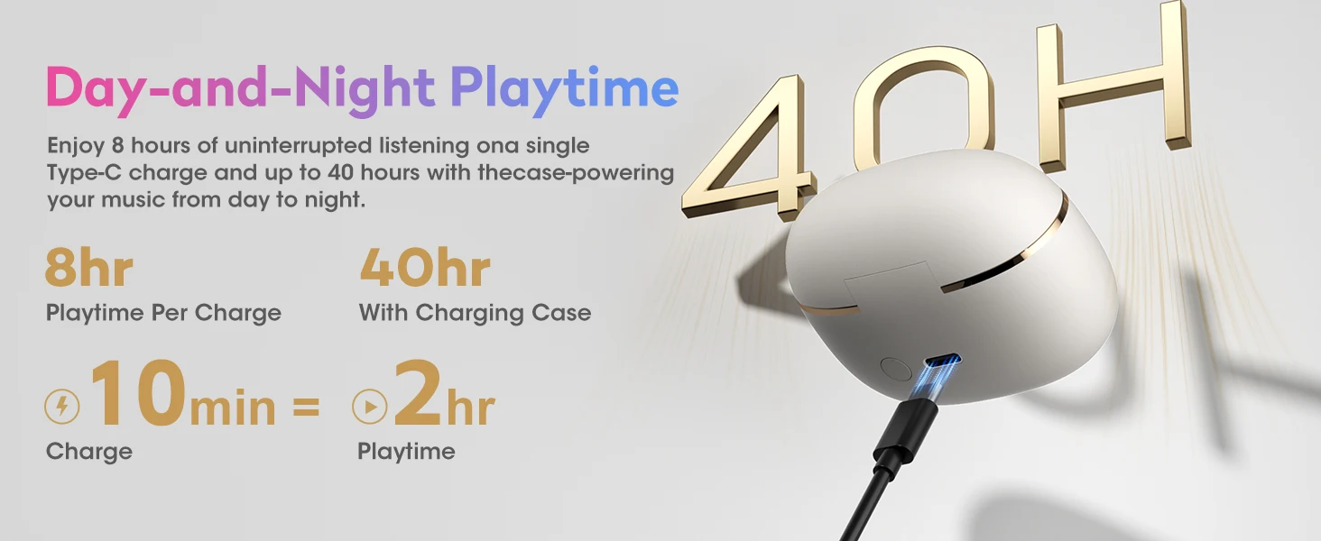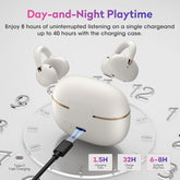 Ohayo A7 Open Ear Earbuds ensures long-lasting 8-hour battery life and up to 40 hours of total playback. With fast charging, just 10 minutes of charge provides 2 hours play.