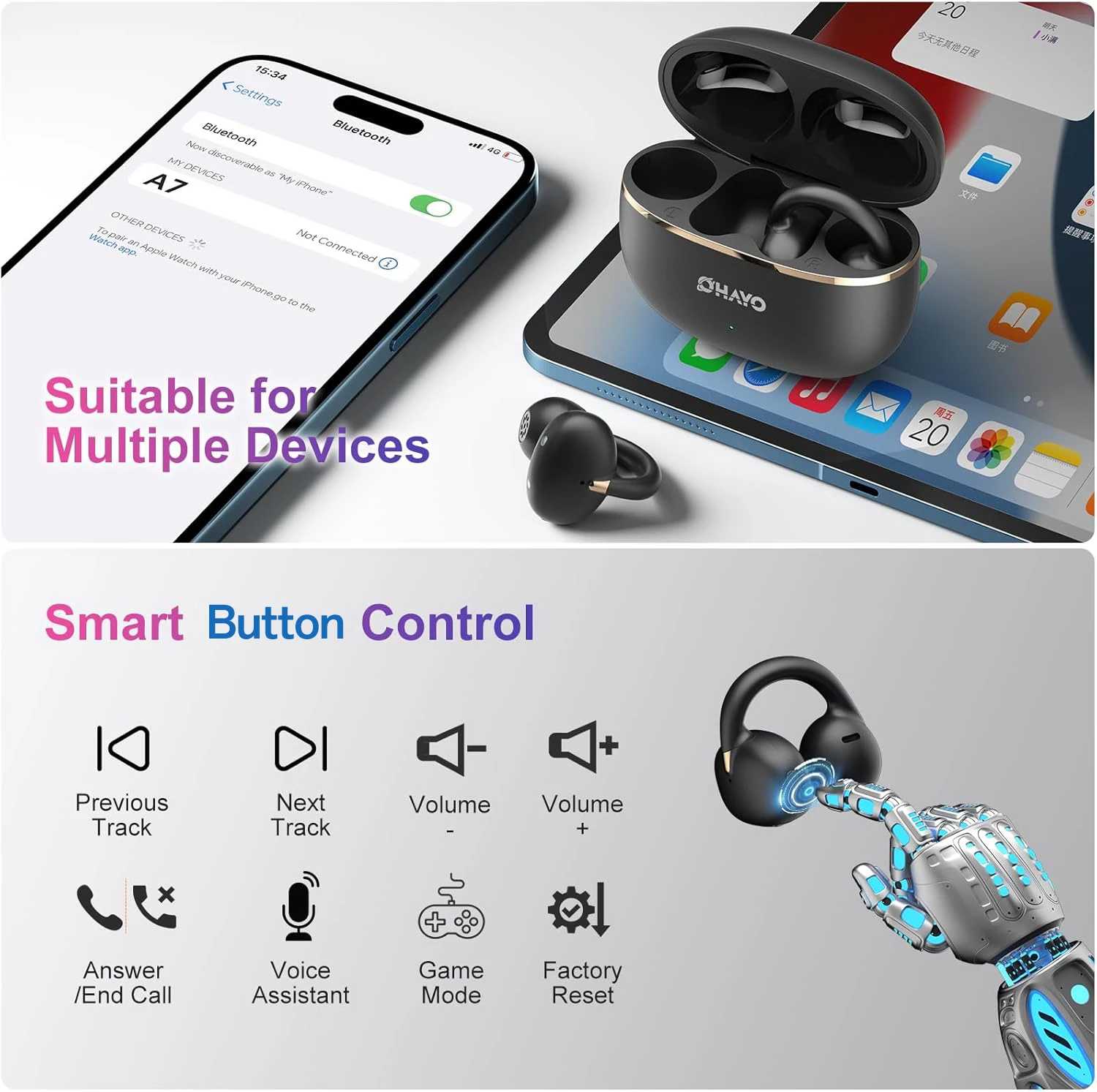 OHAYO A7 AiryClamp by Ortizan,Open Ear Earbuds Wireless Headphones Bluetooth 5.4 Earphones Clip On Ear Buds with Mic, IPX7 Waterproof, 40 Hrs Play for Running Cycling Fitness