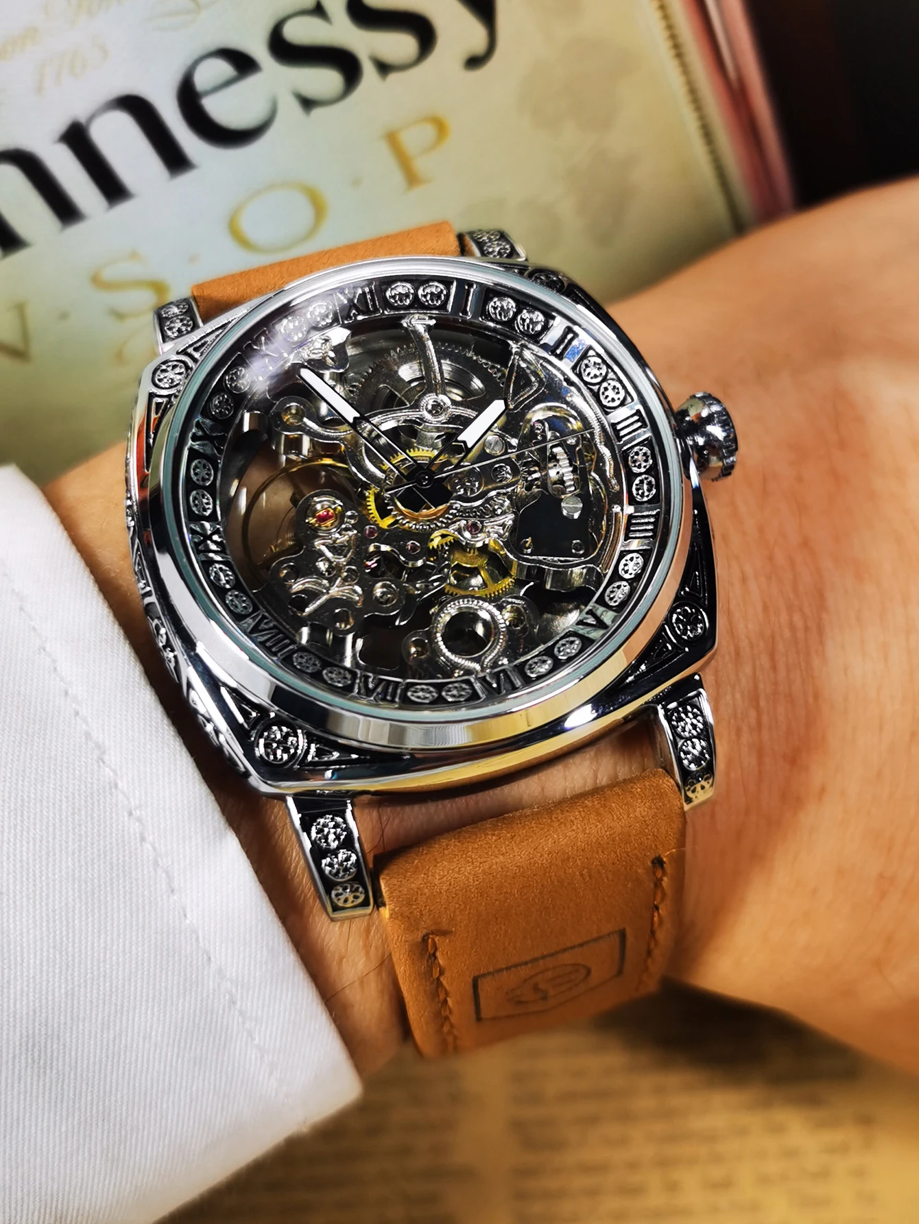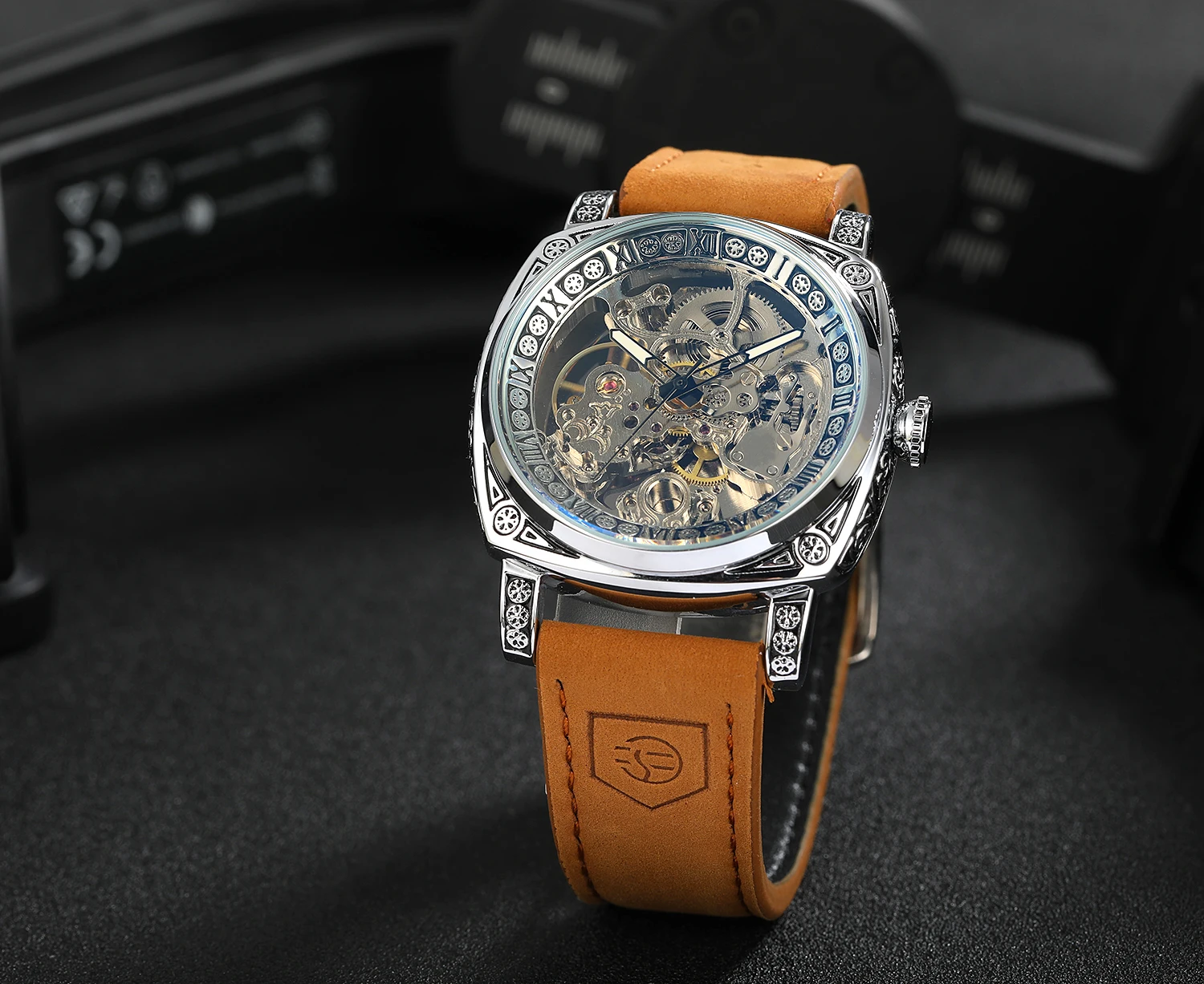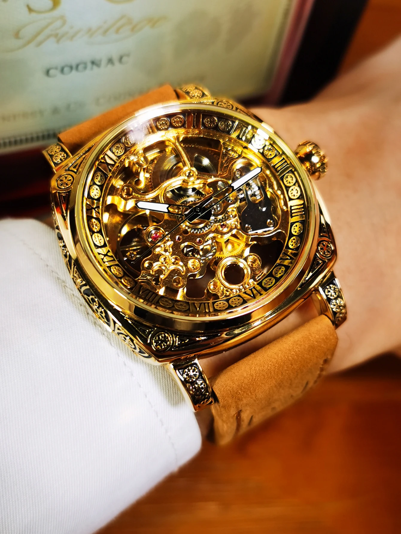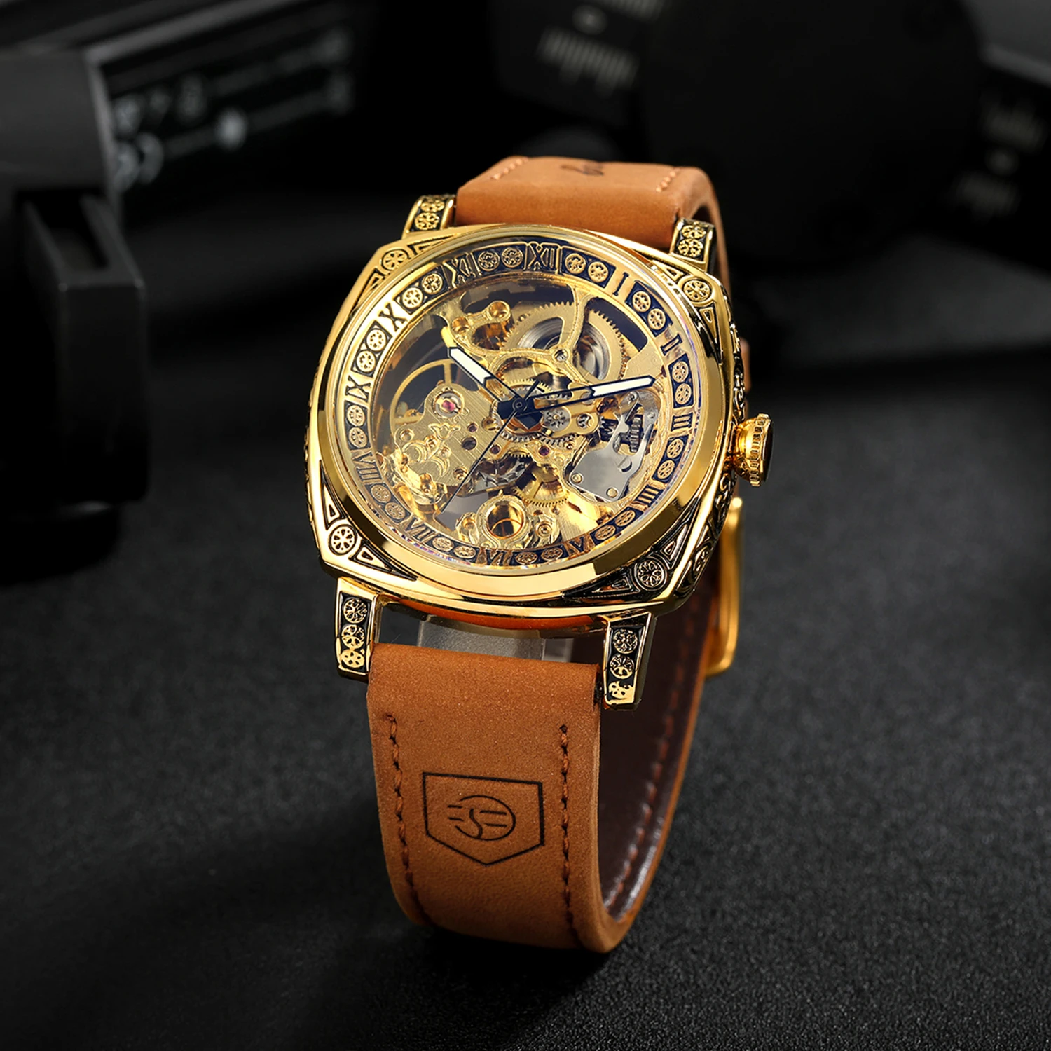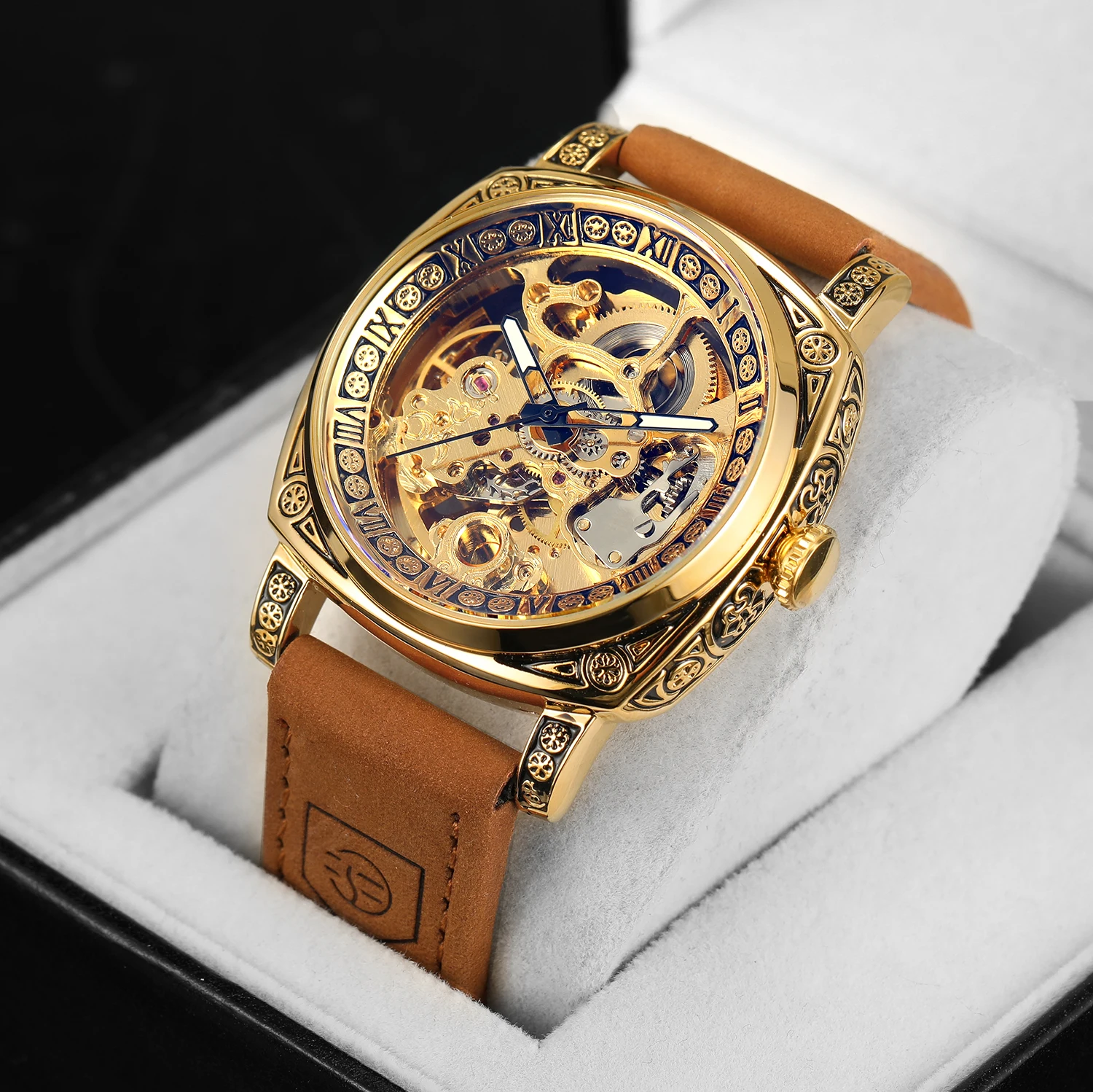 Forsining Retro Luxury Mechanical Watch for Men Engraved Case Leather Strap Luminous Business Classic Automatic Mens Watches New